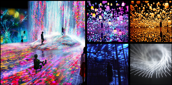 Le collectif japonais TeamLab crée des expositions immersives qui intègrent les visiteurs à l’œuvre d’art. Constituée d’images projetées à 360 o, l’animation évolue au fil des mouvements du public. Ainsi, un pas, un geste, un déplacement modifient les tableaux, l’éclairage et les effets visuels en temps réel. Les représentations de TeamLab ont été diffusées dans plusieurs grandes villes du monde, notamment Tokyo, Milan, Paris, Londres et Melbourne.