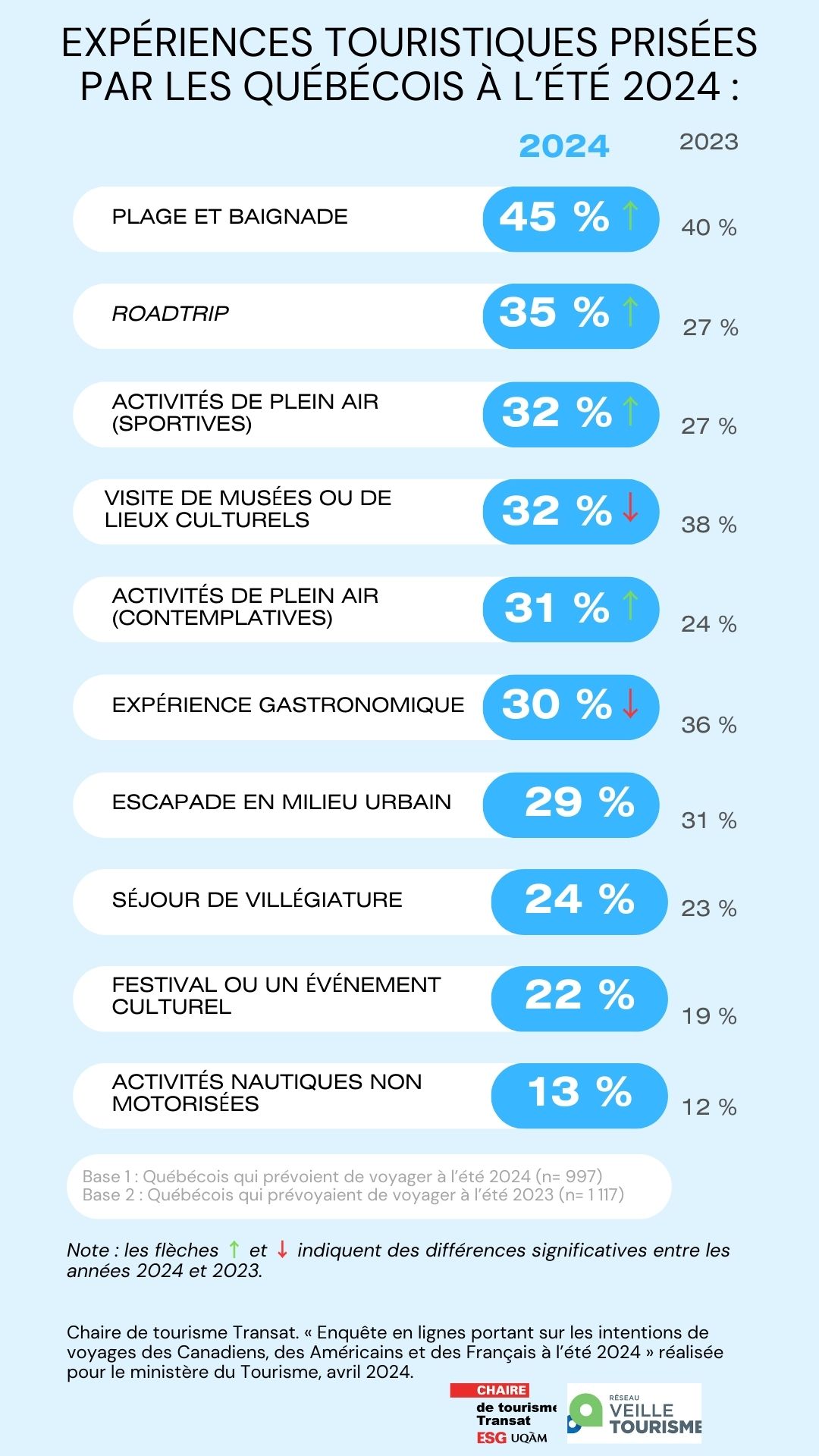 En considérant les expériences recherchées par les Québécois (sans égard à leur destination), on observe quelques légères variations par rapport à l’année dernière. Certaines activités touristiques, telles que la baignade, les roadtrips, ainsi que les activités sportives et contemplatives en plein air enregistrent une infime augmentation. Les visites de musées ou de sites culturels, ainsi que les expériences gastronomiques, suscitent un peu moins d’intérêt en 2024.