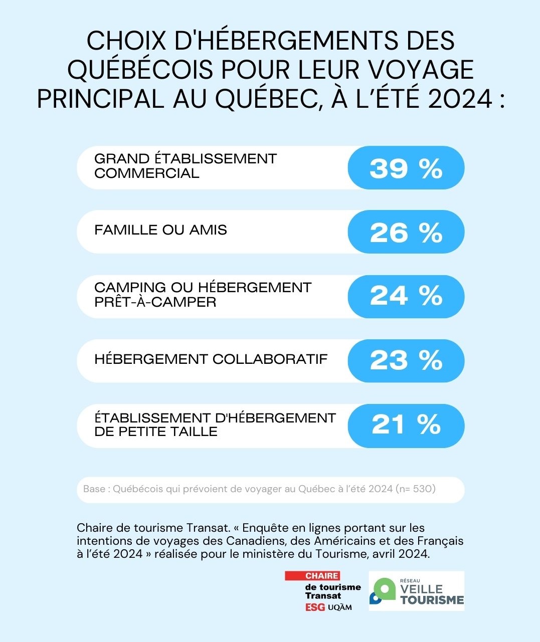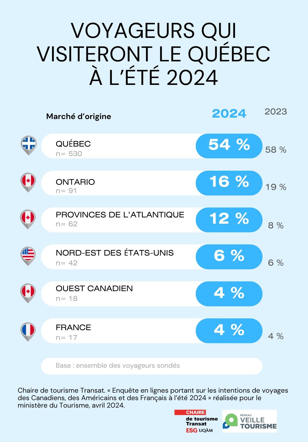 En avril 2024, la Chaire de tourisme Transat a mené un sondage pour le ministère du Tourisme auprès de 3 961 futurs voyageurs estivaux. Ces derniers proviennent de différents marchés géographiques dont le Québec, l’Ontario, les provinces de l’Atlantique, l’Ouest canadien, le Nord-Est des États-Unis et la France. L’objectif de l’étude était de connaître leurs intentions de voyage pour l’été 2024. Plus précisément de répondre à plusieurs questions : qui visitera le Québec cet été ? Quelles destinations privilégieront les voyageurs québécois durant cette période ? Et quelles sont les caractéristiques du voyage principal des Québécois au Québec ?