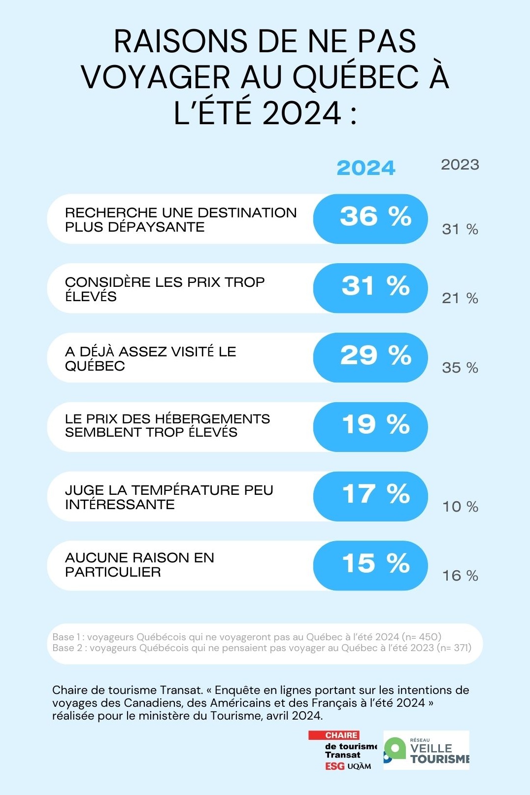 Entre 2023 et 2024, les raisons pour lesquelles les voyageurs québécois n’optent pas pour leur province comme destination estivale restent sensiblement inchangées. Ils sont 36 % à rechercher une destination plus dépaysante, 31 % considèrent les prix trop élevés et 29 % ont déjà visité le Québec. Bien que les pourcentages aient globalement augmenté, aucune variation significative n’est à relever dans les statistiques par rapport à l’année précédente.
