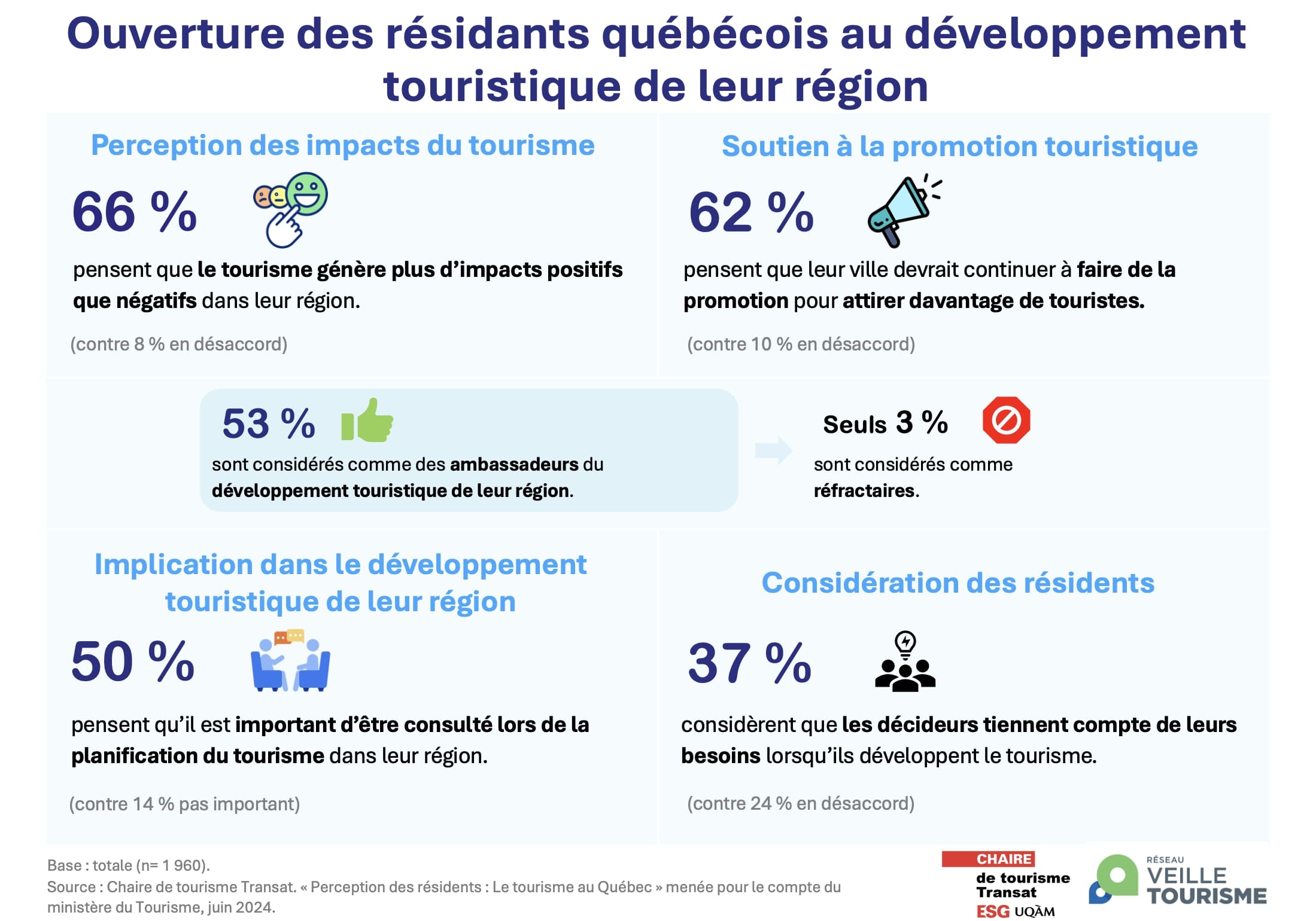 La Chaire de tourisme Transat a réalisé en mars 2024 une enquête pour le ministère du Tourisme auprès de 1960 Québécois. Cette étude visait à évaluer la perception des résidants à l’égard du tourisme régional. Outre le niveau de fierté des résidants, et leur perception des bénéfices et enjeux liés au tourisme, les habitudes touristiques locales, la disposition à endosser un rôle d’ambassadeur, ainsi que les actions jugées nécessaires pour améliorer l’impact du tourisme dans la région ont également été au cœur de l’enquête.