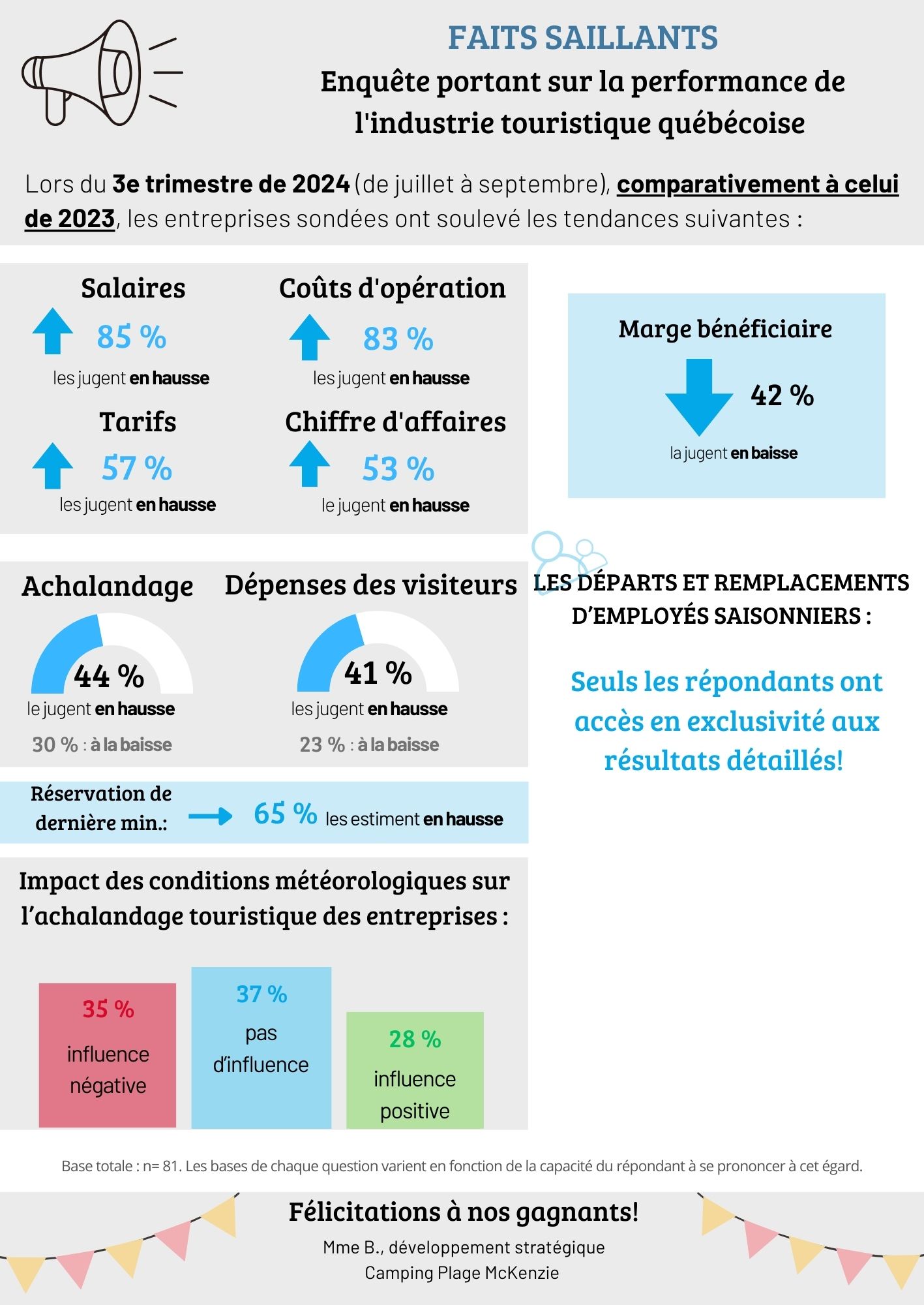 À chaque fin de trimestre, l’équipe de la Chaire de tourisme Transat réalise, pour le compte du ministère du Tourisme, une enquête visant à mesurer et à suivre la performance de l’industrie touristique québécoise grâce à son panel La voix des pros. Les résultats clés de la vague couvrant la période de juillet à septembre 2024 sont présentés ici. Ils suggèrent une hausse modérée de l’achalandage touristique estival par rapport à l’été 2023, malgré un contexte inflationniste persistant et des défis opérationnels.